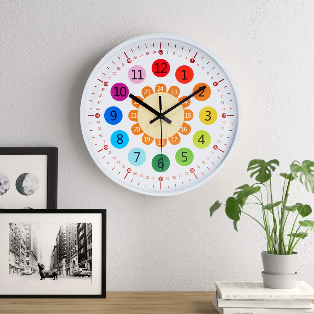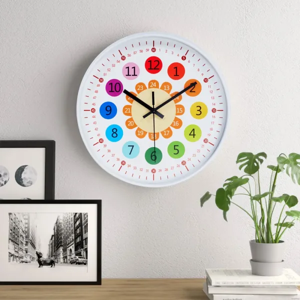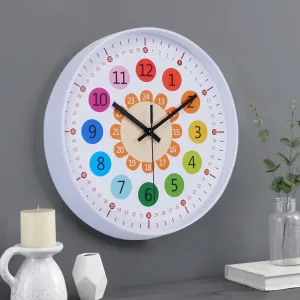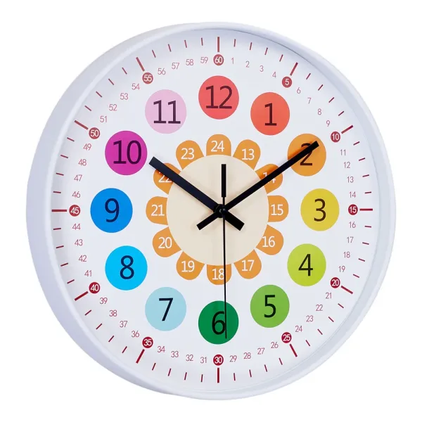 Make learning fun with our vibrant wall clock! Designed with bold colours and an easy-to-read layout, it helps children quickly understand the concept of time. Featuring three colourful rings of numbers, it simplifies both hour and minute reading for young learners. Crafted from durable, child-safe materials, this clock is not just an educational tool but also a playful room decoration that adds a cheerful touch to any space.